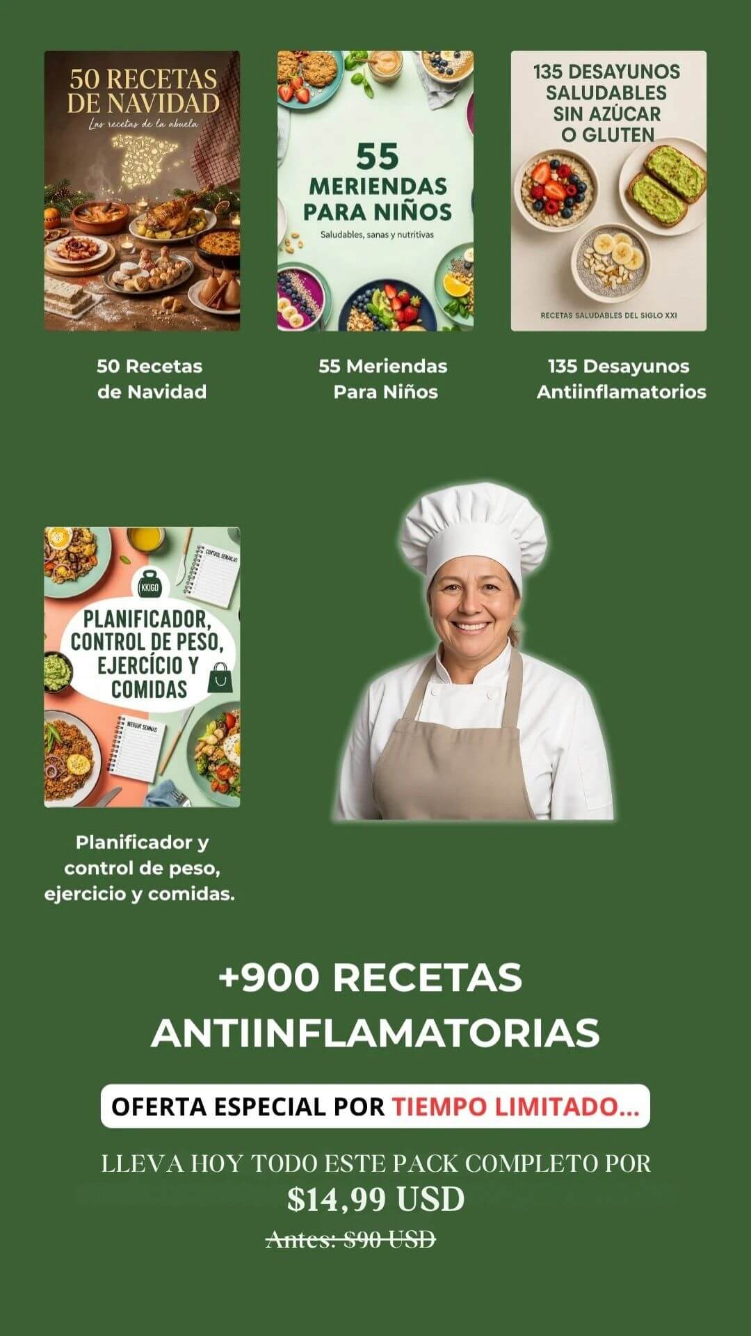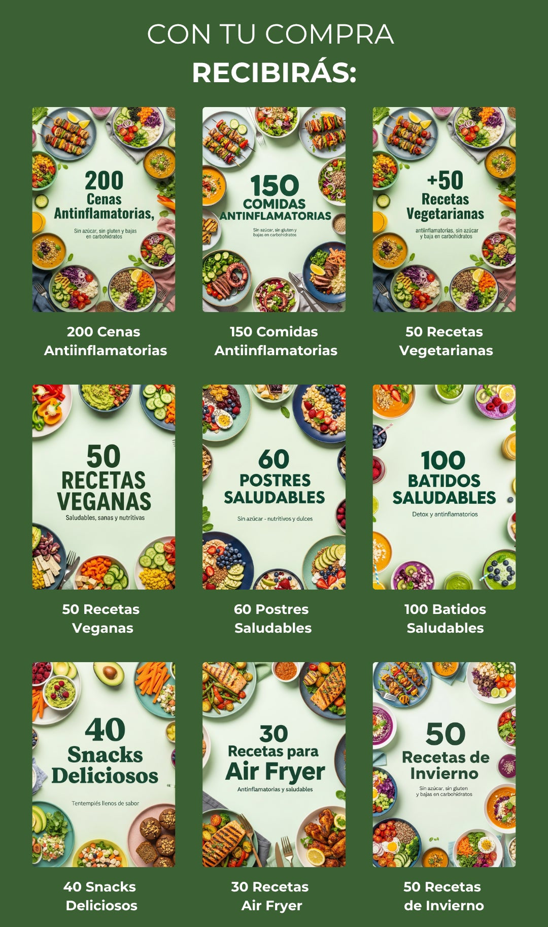 ✅ +300 recetas antiinflamatorias organizadas por momento del día — desayunos, almuerzos, meriendas, cenas y postres